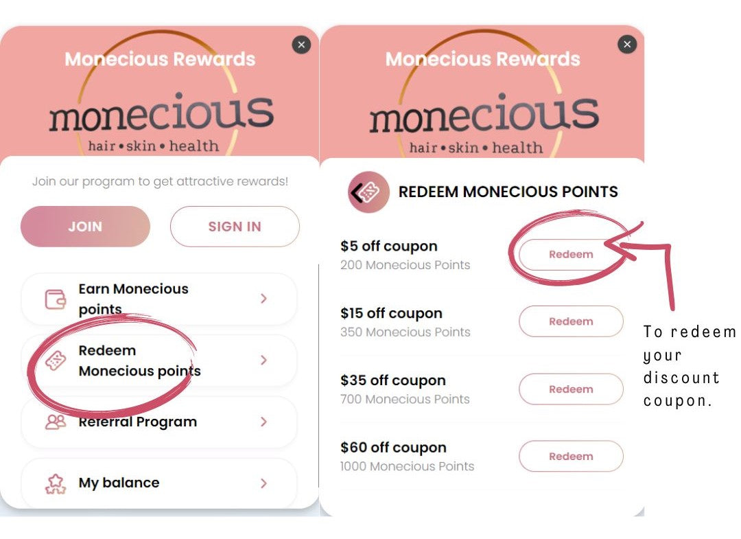 Go to redeem monecious points tab and click your desired discount coupon. Make sure you're logged in to redeem the coupon and check if your purchase met the required minimum purchase.